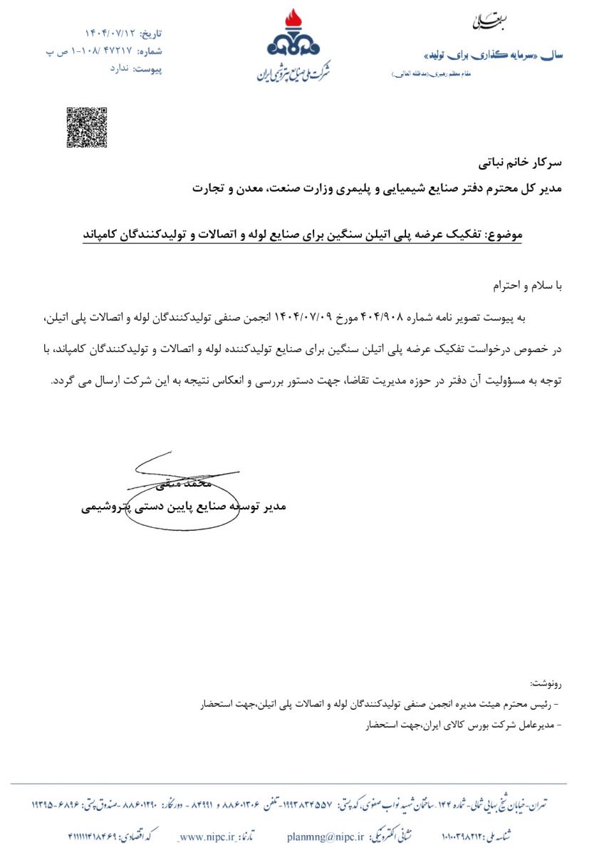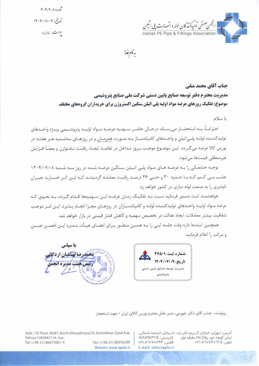 به گزارش پترون در این نامه آمده است در حال حاضر سهمیه عرضه مواد اولیه پتروشیمی ویژه واحدهای تولیدکننده لوله پلی اتیلن و واحد های کامپاند ساز به صورت هم زمان و در روزهای سه شنبه هر هفته در بورس کالا عرضه می گردد این موضوع موجب بروز تداخل در تقاضا ، ایجاد رقابت نامتوازن و بعضا افزایش غیر منطقی قیمت ها می شود.