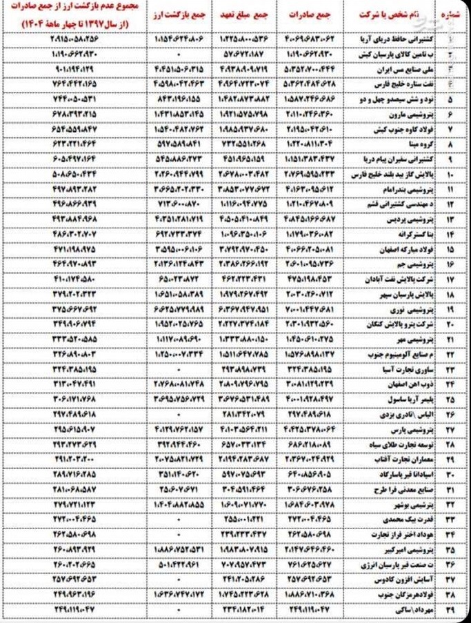 بنابراین این شرکت با اختلاف زیاد در صدر لیست قرار دارد که این شرکت به تنهایی بیش از ۲/۹ میلیارد دلار عدم بازگشت ارز دارد که این رقم معادل سهم عظیمی از بودجه عمومی به ازای هر خانوار ایرانی است.