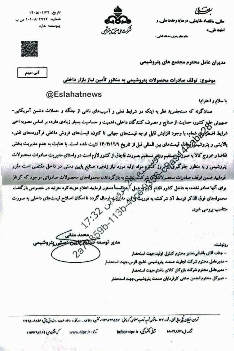 به گزارش پترون مدیر کل دفتر مقررات صادرات و واردات وزارت صنعت با صدور نامه ای به سرپرست دفتر صادرات گمرک، مصوبه توقف صادرات محصولات پتروشیمی، محصولات تولیدی صنایع پایین دستی و … تا اطلاع ثانوی را با هدف تامین نیاز بازار داخلی و جلوگیری از کمبود مواد اولیه در صنایع پاییندستی، ابلاغ کرد.