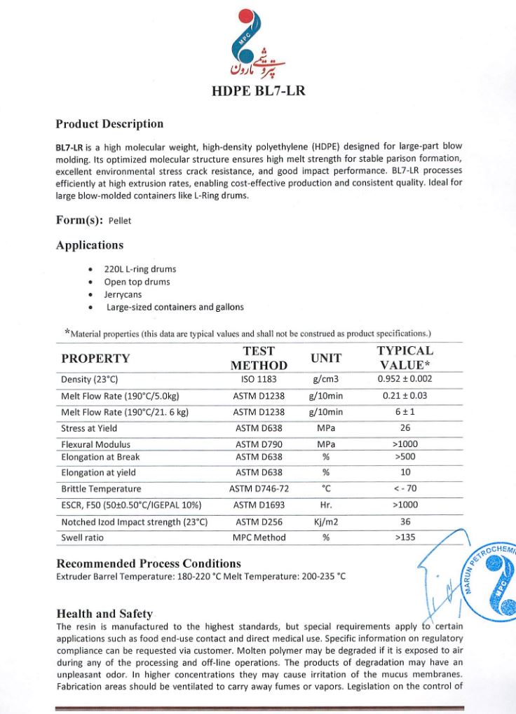 به گزارش پترون پتروشیمی مارون دیتاشیت و آنالیز فنی گرید پلی اتیلن سنگین بادی BL7_LR را منتشر کرد