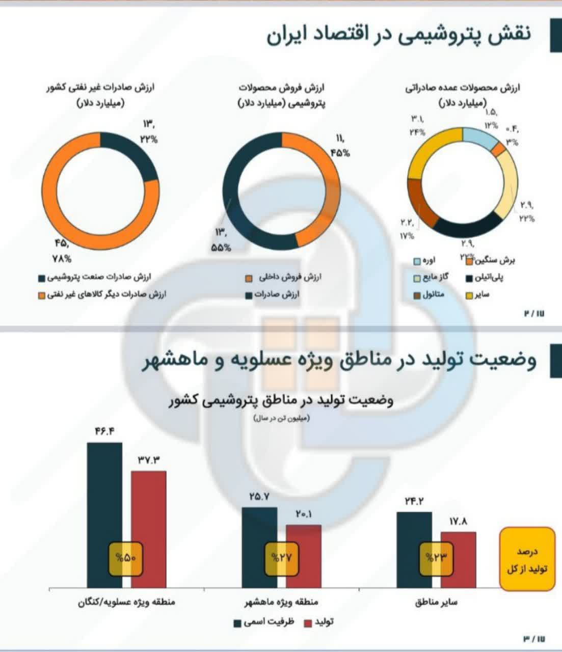 عسلویه و ماهشهر؛ قلب تپنده پتروشیمی ایران ، تحلیل وضعیت تولید در مناطق ویژه نشان‌دهنده یک تمرکز استراتژیک است؛ ۵۰ درصد تولید پتروشیمی ایران تنها در منطقه عسلویه و کنگان و ۲۷ درصد آن در ماهشهر متمرکز شده است. این تجمع ۷۷ درصدی تولید در دو منطقه ساحلی، نشان‌دهنده این واقعیت است که کوچکترین اختلال در این زیرساخت‌ها می‌تواند صادرات غیرنفتی کشور را با شوک عظیم و فلج‌کننده مواجه کند.